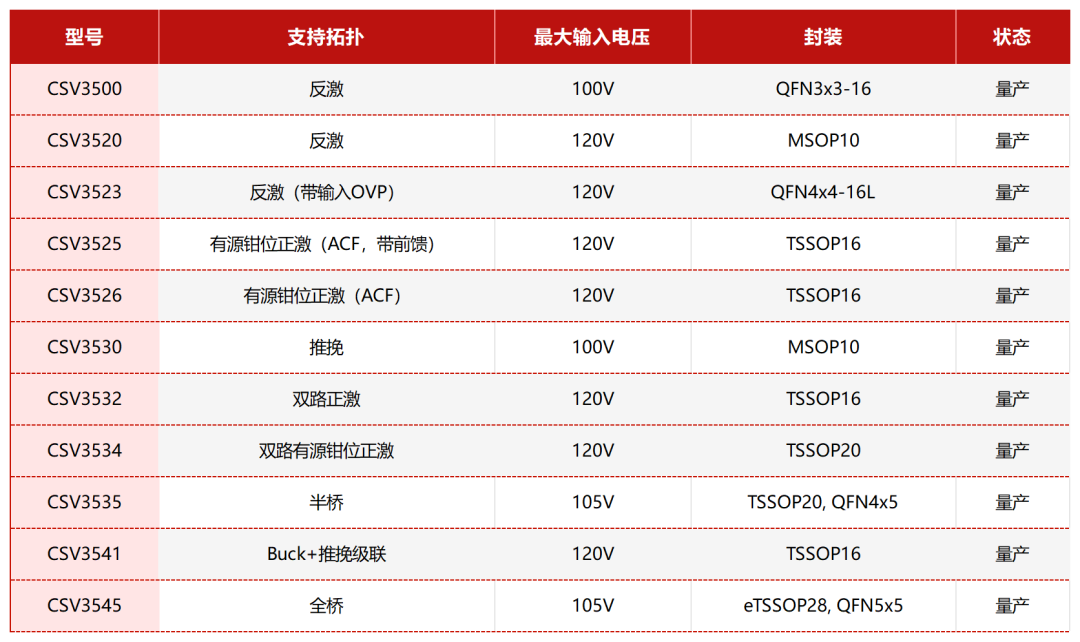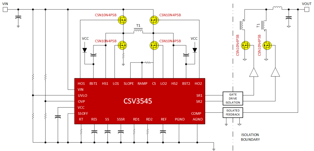 CSV3545集成了初级栅极驱动,同时为次级同步整流提供了驱动信号。初级输出和同步整流输出之间的前沿和后沿死区时间可通过外部电阻可设置。CSV3545还具备逐周期限流、打嗝模式重启、过温保护、可调原边软启动、可调同步整流软启动,可同步外部时钟等丰富功能。因此可泛应用于工业模块电源,服务器电源,通信电源,新能源车等众多领域。
