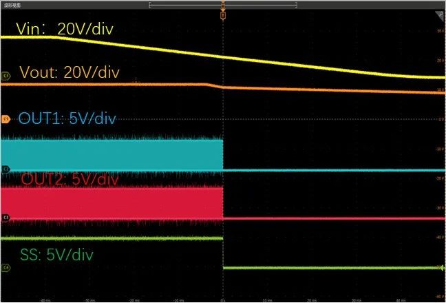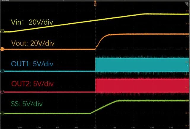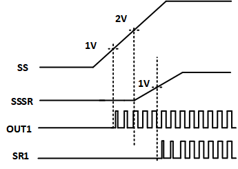 CSV3545还可通过SSSR管脚电容设置同步整流软启动时间,逐渐打开同步整流输出的稳态占空比。在原边软启动管脚SS电压上升到1V时,主管驱动逐步开启,当SS电压高于2V时,SSSR管脚电容由一个20uA的电流源开始充电,SSSR电压上升到1V时,才有同步整流信号SR1和SR2软启动输出。此功能可以防止在输出预偏置下,输出在同步整流MOSFET接入时向输入倒灌电流。软启动时序如图7所示: