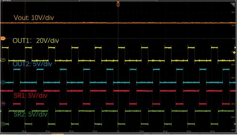 同步整流输出SR2的下降沿与主输出OUT2的上升沿之间存在延迟时间T1,同步整流输出SR2的上升沿和主输出OUT2的下降沿之间存在延迟时间T2,如图6所示: